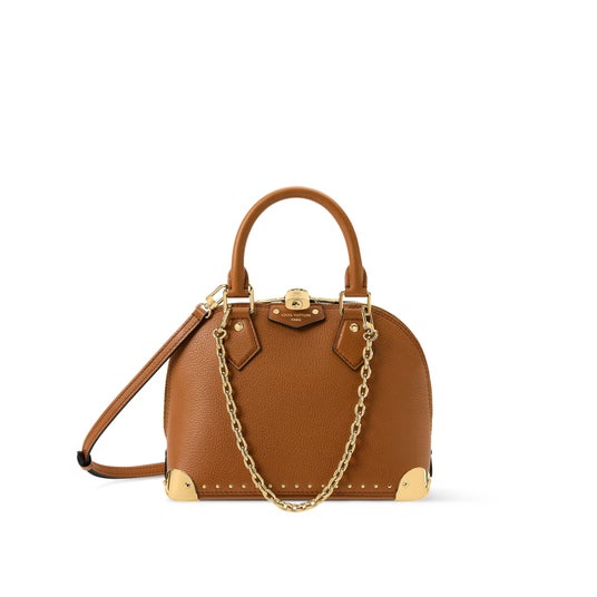 タイムレスなスムースレザーで仕上げた「アルマ・トランク BB」。シグネチャーのパドロック(錠前)やトランクを想わせるコーナー部分、装飾的なチェーンに至るまで、光沢感のあるゴールドカラーの金具が特徴的な一品です。普段の必需品が収納できるサイズのエレガントかつ機能的なデザインで、カードケースや小物を安全に保管できるフラットポケットも備えています。