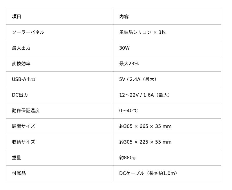 単結晶シリコンパネル3枚を採用し、最大30Wの発電能力を実現。変換効率は最大23%と高効率で、スマートフォンなどのUSB対応機器に直接給電できます。