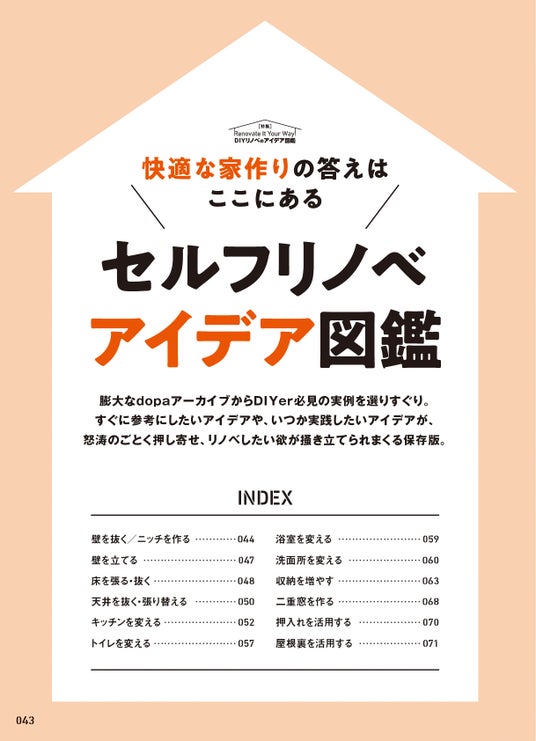 膨大なdopaアーカイブから、DIYer必見の実例を編集部が厳選。壁、床、天井……部位別の事例をはじめ、キッチン、水回り、押入れ、屋根裏、収納など空間別に事例を紹介。すぐに参考にしたいアイデアや、いつか実践したいアイデアが、怒涛のごとく押し寄せ、リノベしたい欲が掻き立てられまくる保存版!
