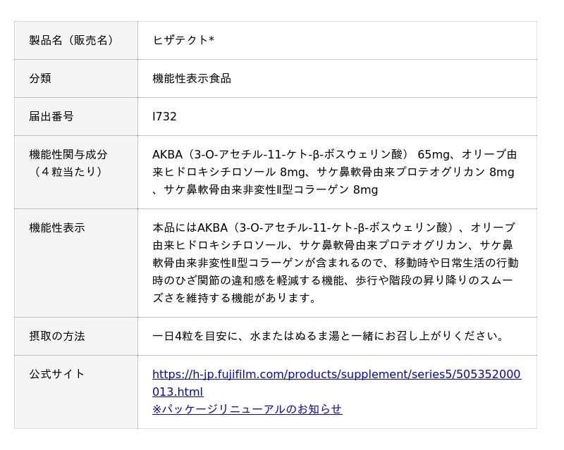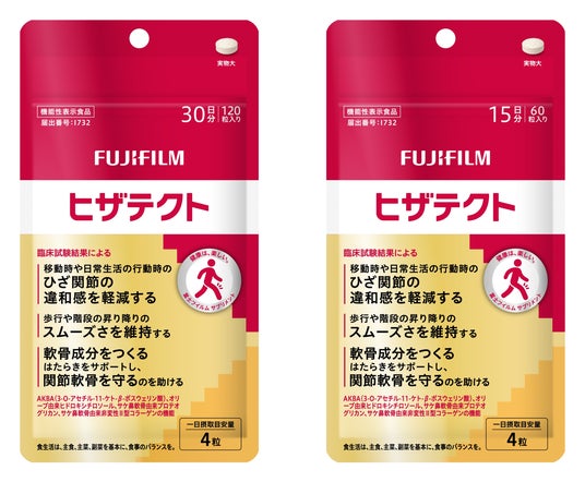 富士フイルム株式会社(本社:東京都港区、代表取締役社長・CEO後藤 禎一)は、2024年3月に発売した機能性表示食品「ヒザテクト」が発売2周年を迎えたことをお知らせします。「ヒザテクト」は、日本で初めて※1「軟骨成分をつくるはたらきをサポートし、関節軟骨を守るのを助ける」機能を表示した機能性表示食品です。歩行や階段の昇り降りの際、また曲げ伸ばしを伴う動きの際にひざ関節の違和感や不快感がある方におすすめです。