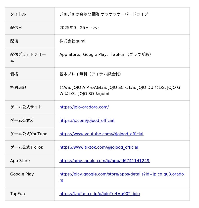 ※本情報の掲載及び画像掲載の際は、コピーライト「(C)A/S, JOJO A P (C)A&L/S, JOJO SC (C)L/S, JOJO DU (C)L/S, JOJO GW (C)L/S, JOJO SO (C)gumi」の表記をお願いいたします。