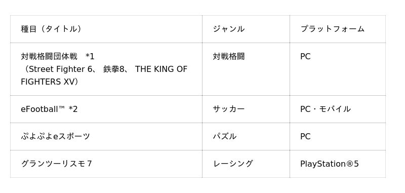 *1 「対戦格闘団体戦」種目は、各タイトル1名ずつ、合計3名の選手でチームを編成し、1つのメダルを争います。