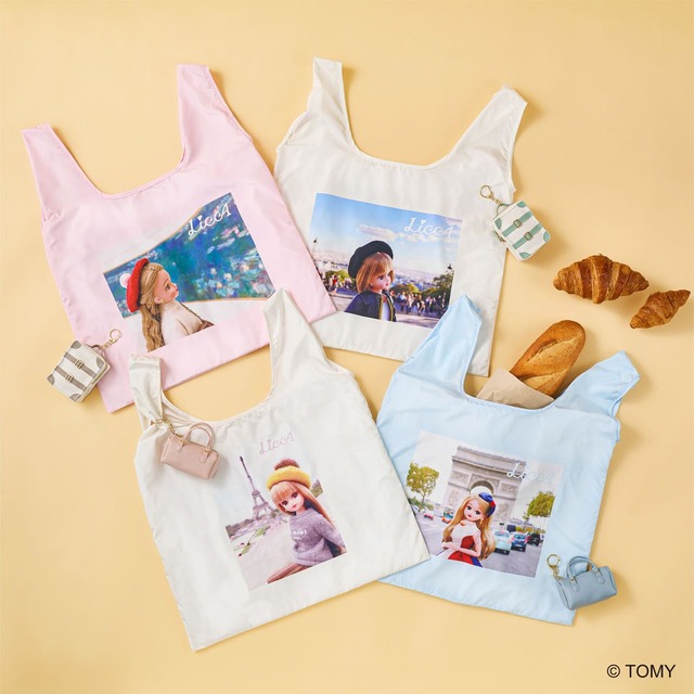 リカちゃんのフランスでのフォトスナップ風のデザインがかわいい「チャーム付エコバッグ」は、全4種類。