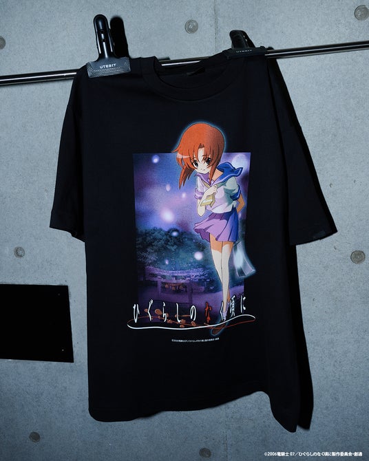 2006年に放送されたアニメ『ひぐらしのなく頃に』より、印象的なキービジュアルを大胆にプリントしたTシャツです。ヒロイン・竜宮レナが後ろ手に鉈を持ちながら微笑む、可愛らしさと狂気が入り交じる本作を象徴するキービジュアルを採用しました。