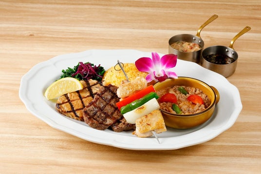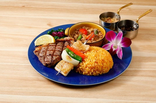チャモロプレートアンガスサーロインステーキ&鶏のブロシェット / 3,608円(税込)ココナッツで煮込んだ牛ひき肉をご飯と共に、ケール添えてさっぱりと。アンガスステーキとブロシェット