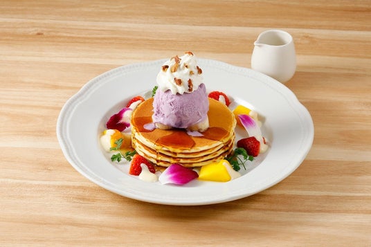 紫芋アイスのパンケーキ / 1,738円(税込)ロイヤル自慢のパンケーキに紫芋アイスやマンゴーを彩り豊かにトッピング。