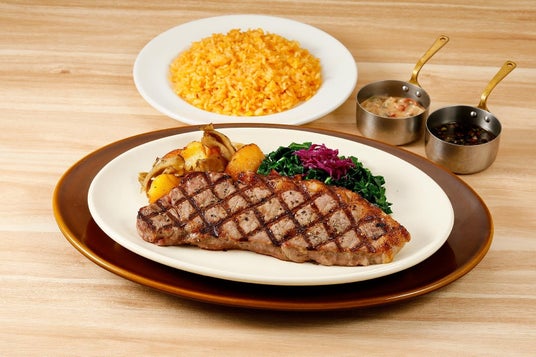 アンガスサーロインステーキ フィナデニソースとココナッツディナンシェ添え(レッドライス付き)/ 4,378円(税込)グアムスタイルのジューシーなアンガス牛ステーキに、しょうゆベースのフィナデニソースとココナッツディナンシェを添えた一皿。