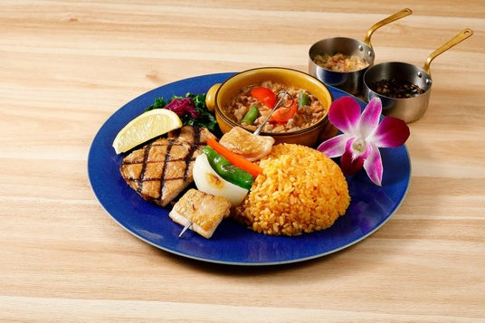 3種のグリルにレッドライスなど定番料理を盛り込んだ、本場の味を楽しめるプレート。