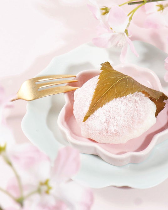 柔らかな求肥で、スポンジ、カスタード、桜あん、サワーチェリーを包み込みました。桜葉の塩漬けが甘みを引き立てる、和洋の幸せな出会いです。