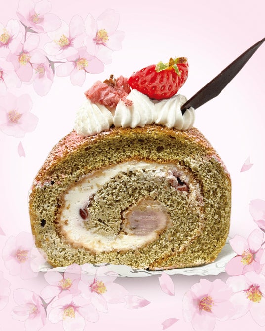 桜の葉を練り込んだしっとり生地で、桜あんとサワーチェリーをロール。苺と桜を添えた華やかな見た目も魅力。