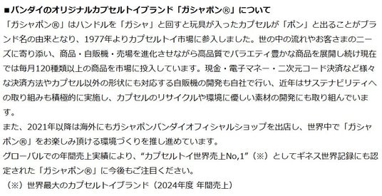 ※「ガシャポン」「めじるしアクセサリー」「プレミアムガシャポン」「フラットガシャポン」はバンダイの登録商標です。