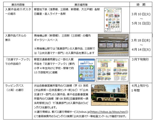 入賞作品は、都営地下鉄等の各駅でのポスター掲示、地下鉄駅構内での入賞作品パネルの展示、交通局発行の「交通マナーブック」への掲載、ラッピングバスの運行など、公共交通利用時のマナー啓発等に活用いたします。