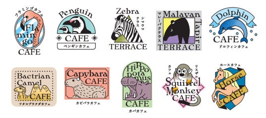 - 場所:1.フラミンゴカフェ(BIRDTOPE)2.ペンギンカフェ(ふれあい広場)3.シマウマテラス(サファリワールド)4.マレーバクテラス(サファリワールド)5.ドルフィンカフェ(イルカふれあいプール)6.フタコブラクダカフェ(ファミリー広場)7.カピバラカフェ(ふれあい広場)8.カバカフェ(ふれあい広場)9.リスザルカフェ(鳥の楽園)10.ホースカフェ(ホースキャンプ)
