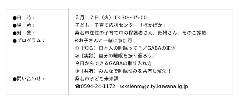 総合食品メーカー、ヤマモリ株式会社(本社:三重県桑名市、社長:三林 圭介)は、3月18日の「春の睡眠の日(※)」に合わせて開催される桑名市主催イベント「Good Sleep KUWANA- GABA×睡眠で整えるライフスタイル」でGABAと睡眠の関係についてのセミナーに登壇致します。
