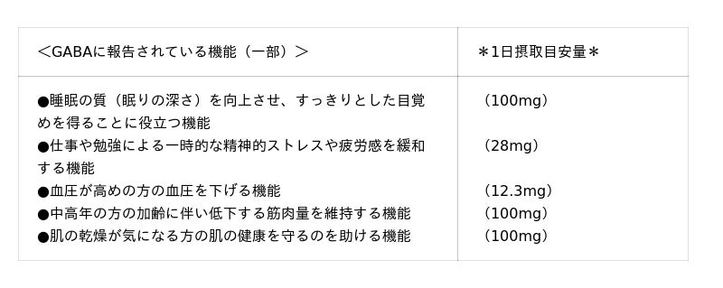 GABAはγ-アミノ酪酸と呼ばれるアミノ酸の1種で、以下に示されるような数々の機能が報告されています。