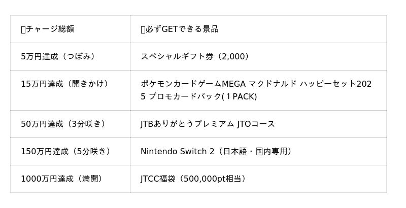 期間中のチャージ総額が以下の金額に達すると、それぞれの景品をGETできます。