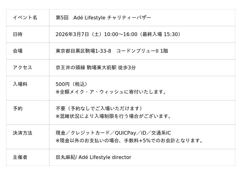 「毎日に、上質とやさしさを。」をコンセプトに、デザイン性と実用性を兼ね備えたアイテムを展開する「Ade Lifestyle」は、2026年3月7日(土)、第5回となるチャリティーバザーを東京・駒場にて開催いたします。本バザーは、ブランド発足時より継続している公益財団法人メイク・ア・ウィッシュ オブ ジャパン(以下、メイク・ア・ウィッシュ)への支援活動の一環として実施するものです。売上の一部に加え、入場料500円(税込)の全額をメイク・ア・ウィッシュに寄付いたします。