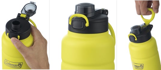 左)ワンタッチオープン気軽にすぐ飲める 中央)誤作動を防ぐロック機能付きでバックパックに入れても安心 右)ハンドル付きで持ち運びも便利