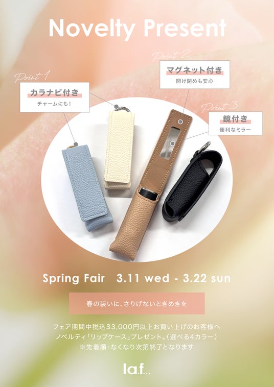 la.f...(ラエフ)では、3月11日(水)~3月22日(日)スプリングフェアを開催いたします。税込33,000円以上お買い上げのお客様には、リップケースをプレゼントいたします。(数量限定)