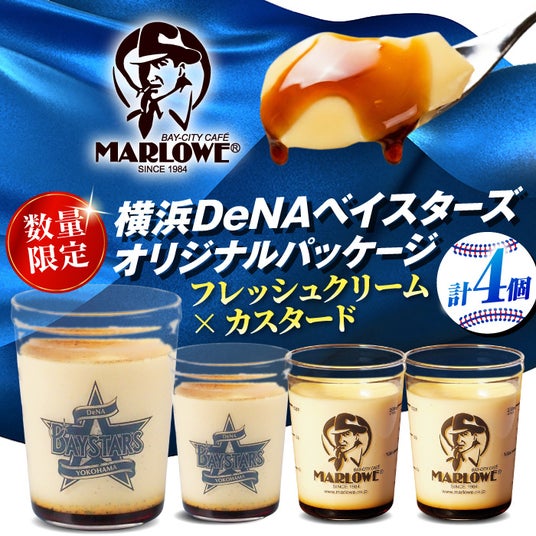 横須賀を代表する手作り焼きプリン専門店「MARLOWE(マーロウ)」の返礼品。容器に横浜DeNAベイスターズのオリジナルデザインを施した、ふるさと納税限定・特別仕様のプリンです。