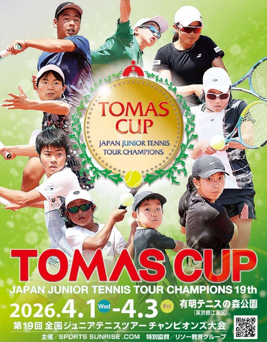 株式会社リソー教育グループ(本社:東京都豊島区、代表取締役社長:天坊真彦)は、2026年4月1日(水)から4月3日(金)にかけて東京都内で開催される、第19回 全国ジュニアテニスツアー チャンピオンズ大会「TOMAS CUP 2026」に、特別協賛いたします。