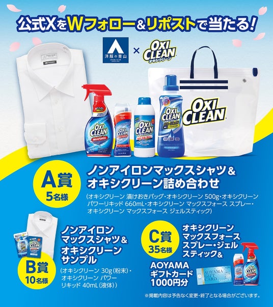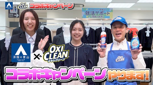 株式会社グラフィコ(代表取締役:マイケル・リード)が展開する、酸素系漂白剤「オキシクリーン」は、青山商事株式会社(本社:広島県福山市、代表取締役社長:遠藤 泰三)が展開する「洋服の青山」とコラボし、2026年3月7日(土)より「新生活を応援!キャンペーン」を一部店舗およびSNSにて実施します。先駆けて3月6日(金)18時より、オキシクリーンの“中の人”と洋服の青山スタッフによる「新社会人のシャツ悩み解決編」YouTube動画を公開します。