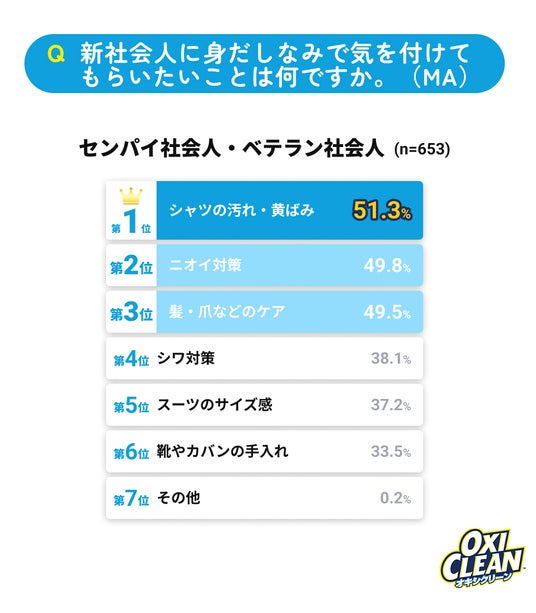 センパイ・ベテラン社会人(20-50代)で最も多かった回答は『シャツの汚れ・黄ばみ(51.3%)』でした。新社会人で最多だった「髪や爪のケア」を上回る結果となり、シャツの清潔さ、管理状態に目を向けられていることが明らかになりました。