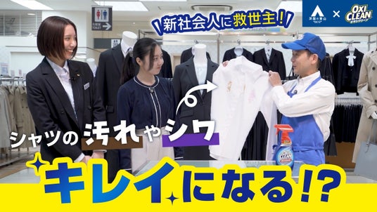 オキシクリーンの“中の人”と洋服の青山スタッフが、新生活シーズンに増えるシャツトラブルを検証。「襟・袖の皮脂汚れ」「うっかり食べこぼし」といった新社会人あるあるの悩みに、オキシクリーンが実践形式で挑みます。