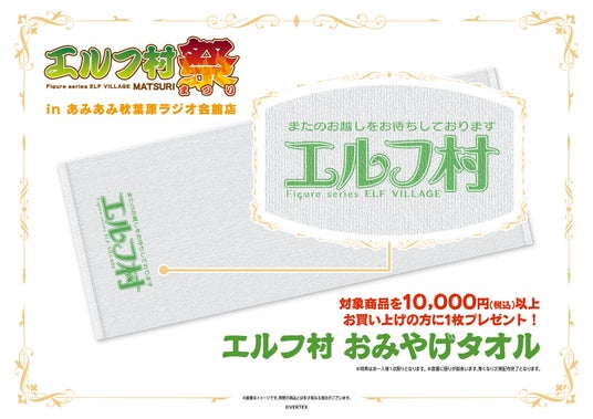 美少女フィギュアブランド「ヴェルテクス」が展開するオリジナルフィギュアシリーズ『エルフ村』。対象商品を10,000円(税込)以上お買い上げの方に、<エルフ村 おみやげタオル>を1枚プレゼント!