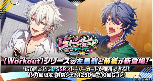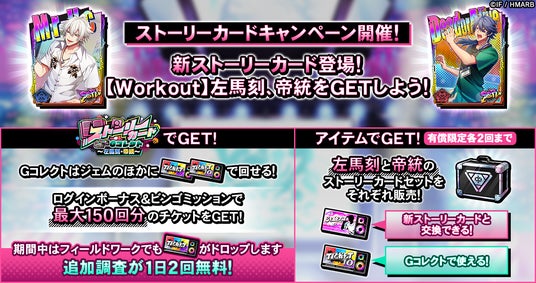 新ストーリーカード「SSR【Workout】碧棺左馬刻」と「SSR【Workout】有栖川帝統」を獲得することができるGコレクトを開催しています。Gコレクトはジェムのほか、専用チケット「ストーリーGコレチケット(vol.5)」各種を使うことでも回すことができ、ビンゴミッションとログインボーナスで最大150回分のチケットを獲得できます。