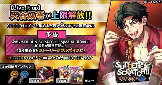 イベント期間中、KILLER SCRATCH!!をプレイするとライズ消費量に応じた確率でSUDDEN SCRATCH!!が発生します。SUDDEN SCRATCH!!をプレイすると、通常の報酬アイテムの他、限定アイテム「SUDDENコイン」を獲得することができます。「SUDDENコイン」を集めることで、「A.R.B remix」楽曲やレイズキー、オオサカ・ディビジョンのデコステッカーに使えるブースターなどと交換することが可能です。また、ストーリーカード「SSR【Live it up】天谷奴零」が上限解放され、最大9枚まで獲得できます。さらに、SUDDEN SCRATCH!!~Special~の開催時には10枚目が獲得可能となり、10枚集めるとカードストーリーがフルボイスに!詳細はアプリ内お知らせをご確認ください。