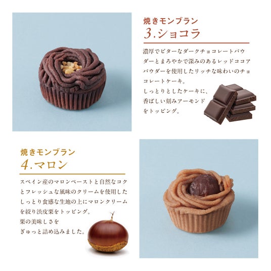 スペイン産のマロンペーストと自然なコクとフレッシュな風味のクリームを使用したしっとり食感な生地の上にマロンクリームを絞り渋皮栗をトッピング。栗の美味しさがぎゅっと詰まった、かわいいモンブランです。