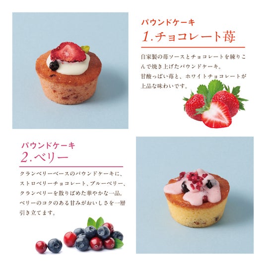 クランベリーベースのパウンドケーキに、ストロベリーチョコレート、ブルーベリー、クランベリーを散りばめた華やかな一品。ベリーのコクのある甘みがおいしさを一層引き立てます。