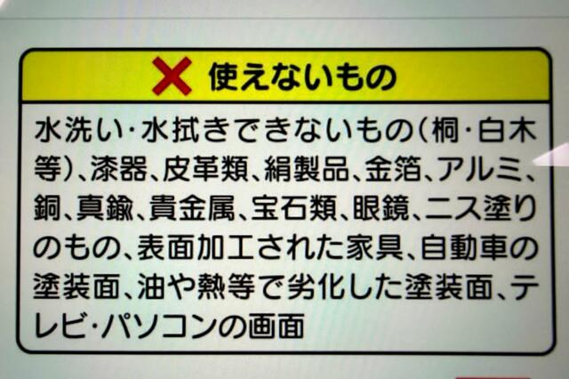 水ベースのクリーナーと言えども、何でも使えるわけではありません。使用NGの素材はあるので注意してください。アルミや銅、皮革類、テレビやパソコンの画面などはNGです。