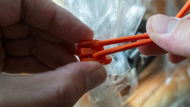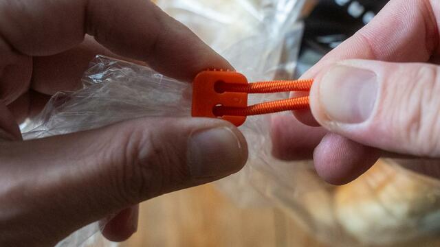 引っ張って、引っ掛けるの2ステップですね。袋の口を縛ったり、輪ゴムを何度も交差させたりする必要がなく、スムーズに留められます。