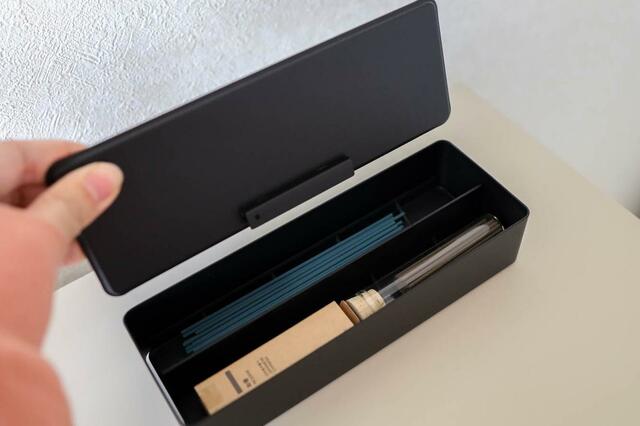 真ん中で分かれており、香りや種類ごとに分けて収納することが可能。一般的な長さのお香は問題なく入り、短めのお香ならケースごと収納できるくらい。