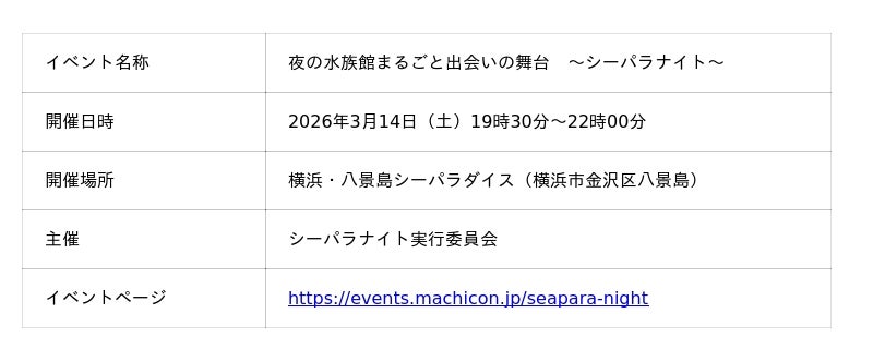 株式会社リンクバル(本社:東京都中央区、代表取締役社長:吉弘和正、証券コード:6046、以下「リンクバル」)が運営するイベントECサイト「machicon JAPAN」は、2026年3月14日に神奈川県の「横浜・八景島シーパラダイス」にて最大1,000名規模で開催される【夜の水族館まるごと出会いの舞台~シーパラナイト~、以下「本イベント」】のチケット販売を行っております。