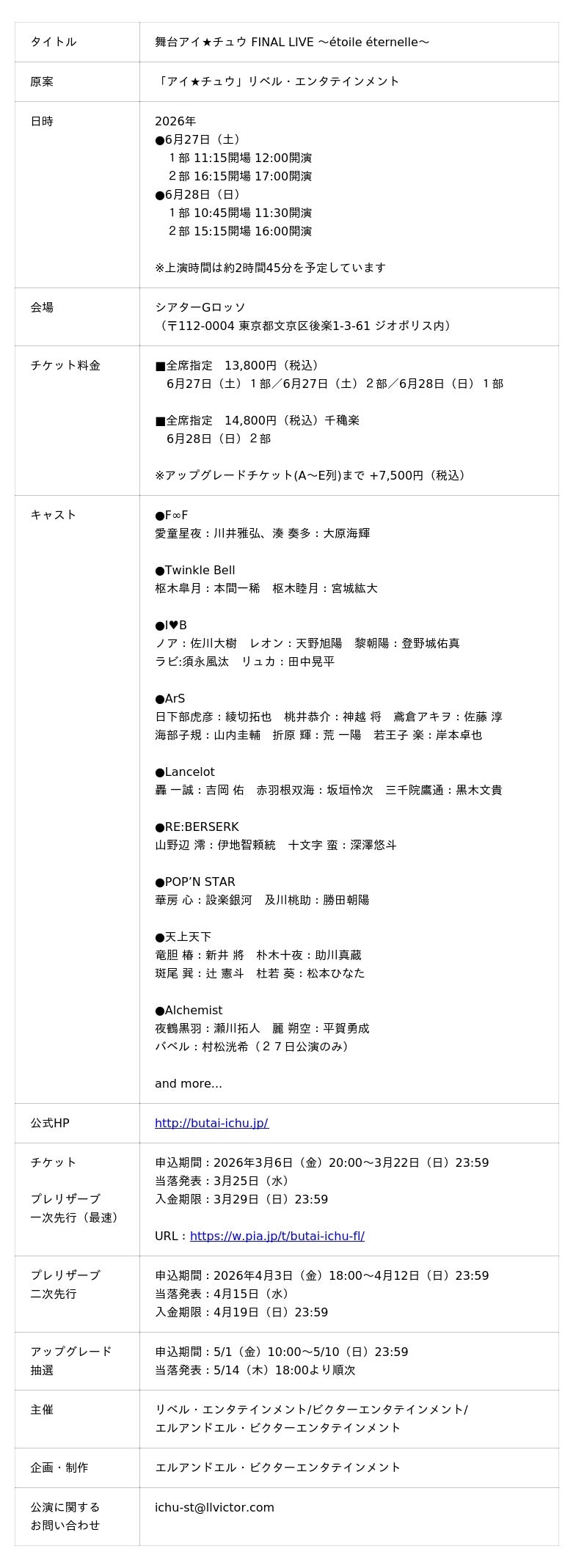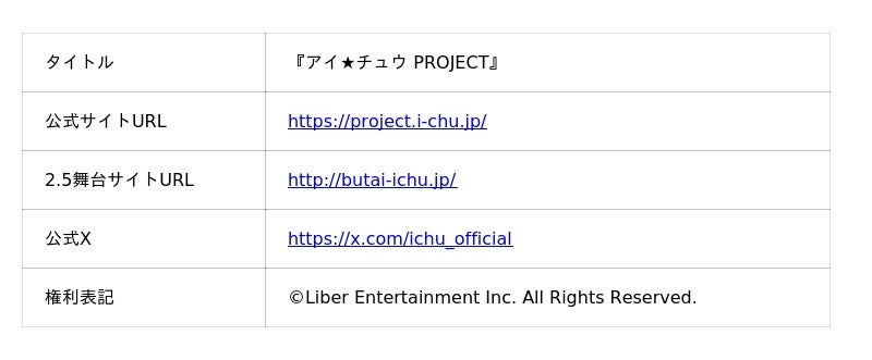 株式会社リベル・エンタテインメントは、アイ★チュウ PROJECT内の舞台化作品「舞台 アイ★チュウ」のライブ・イベント『舞台アイ★チュウ FINAL LIVE ~etoile eternelle~』について、2026年6月27日(土)及び6月28日(日)の2日間、シアターGロッソにて上演することをお知らせします。