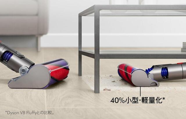 同社のハイエンドモデルに搭載されているような液晶ディスプレイは搭載されていませんが、デジタルモーターによる強力な吸引力は健在。小型化されたヘッドと吸引力が組み合わさって、部屋の隅に溜まったホコリなども吸い取ります。