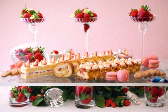 パティシエ自慢のストロベリースィーツが約20種&フレンチオードブルが約15種!イチゴのスムージーや数種類のトッピングで楽しむパフェ、目の前で仕上げるいちごのフランベデザート、モンブランも登場♪