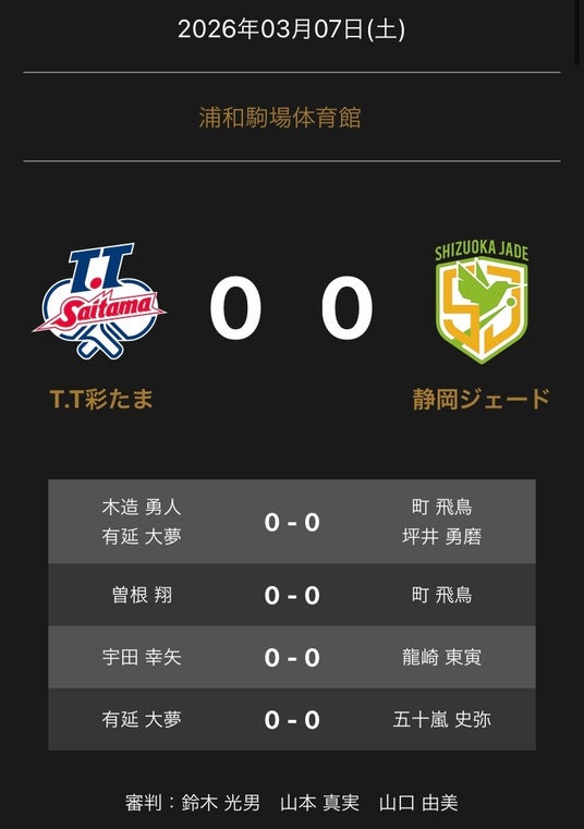ノジマTリーグ 2025-2026 公式戦 3月7日開催 「T.T彩たまvs 静岡ジェード」の対戦オーダーを発表いたします。