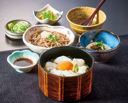 『“北海道産するめいか“いか丼セット』 税込1,770円 主役となるのは、甘みが際立つ「北海道産するめいか」。そのとろけるような食感と素材本来の旨みを存分に堪能できるよう、贅沢な丼に仕上げました。北海道産のがごめ昆布と大和芋を合わせた「特製とろろ」をいか丼にたっぷりとかけることで、いかの甘みがさらに引き立ち、喉越しの良い豊かな味わいが広がります。中央に添えた卵黄を絡めて、まろやかなコクが全体を包み込み、より一層深い美味しさへと変化します。北海道産そば粉を使用した、のど越しの良いお蕎麦との相性も抜群です。ぜひご一緒にお楽しみください。