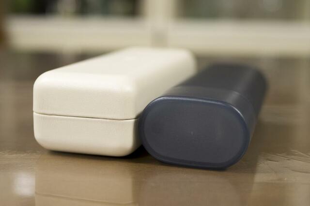 今まで使っていたメガネケースと並べるとこの薄さ、幅が約55mm、厚さが約35mmに高さが約160mmと厚さが抑えられた形ですね。