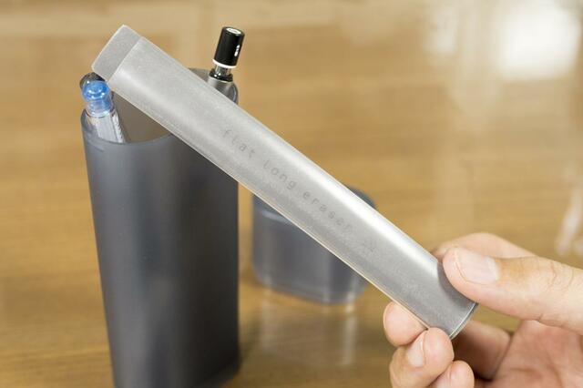 ペンケースとして使うには深さがある自立型ケースなので、消しゴムはペンタイプのものやフラットロングイレイサー(サンスター文具)のような長いものがピッタリですね。