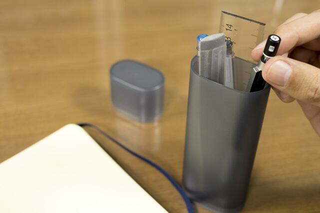 スリムでバッグの中でもかさばりにくく、立てて使えるのでペンケースとして机の上に置いても省スペース!