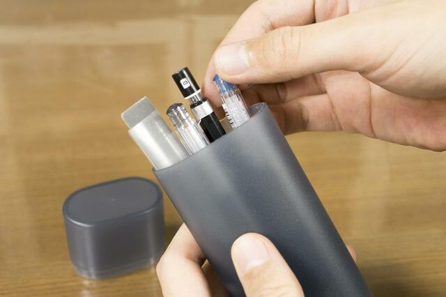 ペンの種類にもよりますが、ペンのみで9本ほど収納可能なので、最低限必要な筆記用具を持ち歩くには十分な容量。