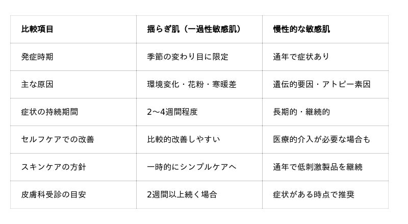 揺らぎ肌は環境変化(花粉、寒暖差など)によって一時的にバリア機能が低下した状態であり、原因が解消されれば改善します。一方、慢性的な敏感肌は遺伝的要因やアトピー素因などが関係していることが多く、通年でのケアが必要です。今回の調査では毎年春に肌トラブルが増える人が44.3%いましたが、そのような方はバリア機能が低下しやすい体質の可能性もあるため、皮膚科でのアドバイスを受けることをおすすめします。