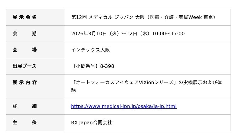 オートフォーカスアイウェア「ViXion01S」を開発・販売するViXion株式会社(東京都中央区、代表取締役社長:南部誠一郎、以下ViXion)は、2026年3月10日(火)から12日(木)にインテックス大阪で開催される、医療・介護・薬局の総合展「第12回 メディカルジャパン 大阪」に出展いたします。