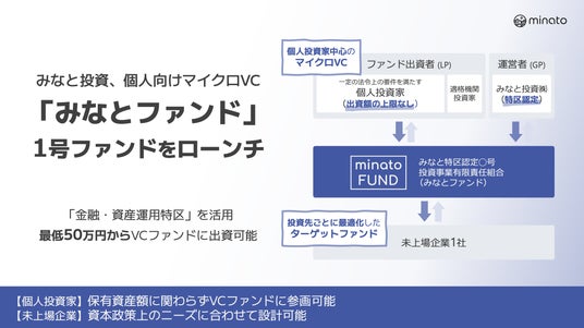 これまでVCファンドに資金供給する主な担い手は、金融機関や事業会社などの法人や資産が一定の規模を超える富裕層などに限られていました。本ファンドでは「金融・資産運用特区」の規制緩和を活用することで、幅広い個人投資家にVCファンドへ参画していただくことが可能になります。なお、みなと投資は2025年3月に全国で初めて、内閣府から「国家戦略特別区域特例ファンド資産運用等事業」の認定を受けております。本件は、個人投資家が投資事業有限責任組合(LPS)に直接出資できる仕組みとして、「金融・資産運用特区」を活用した全国初の取組みとなります。