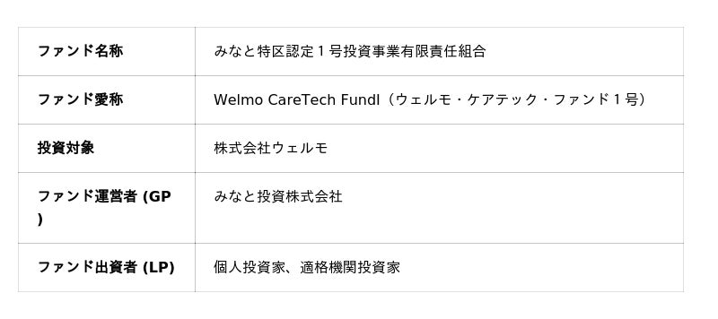 1号ファンドは、介護領域の社会課題解決に取り組むケアテック・スタートアップである株式会社ウェルモ(本社:福岡県福岡市、代表取締役:鹿野佑介)を投資対象とするターゲットファンドです。同社の顧客・提携先を中心とする投資家の皆様にご参画いただき、事業成長に伴走する応援団型の資金供給スキームが実現しました。